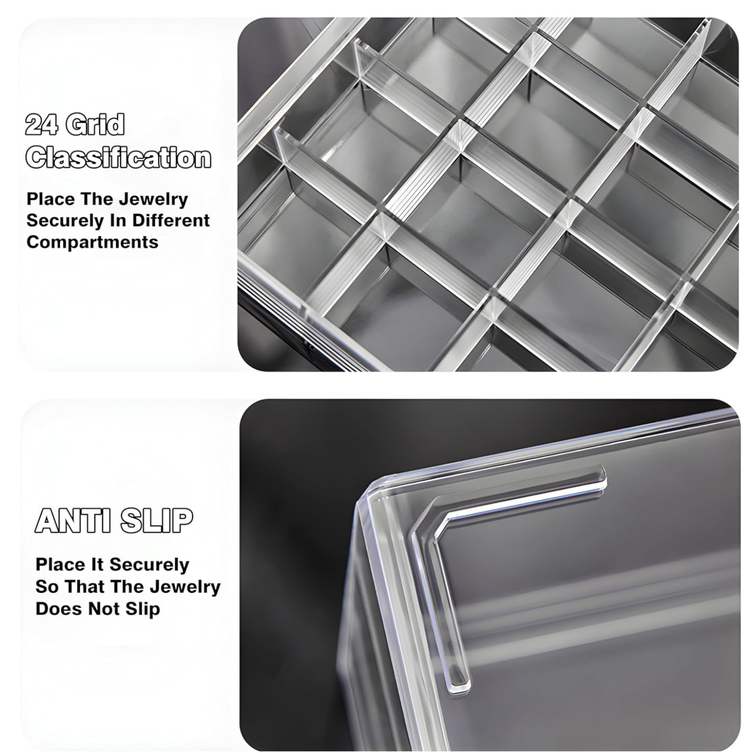 Materialul acrilic transparent face toate bijuteriile vizibile, economisesti timp si pastrezi totul ordonat. Vezi imediat ce vrei sa porti, fara sa deschizi fiecare sertar.
