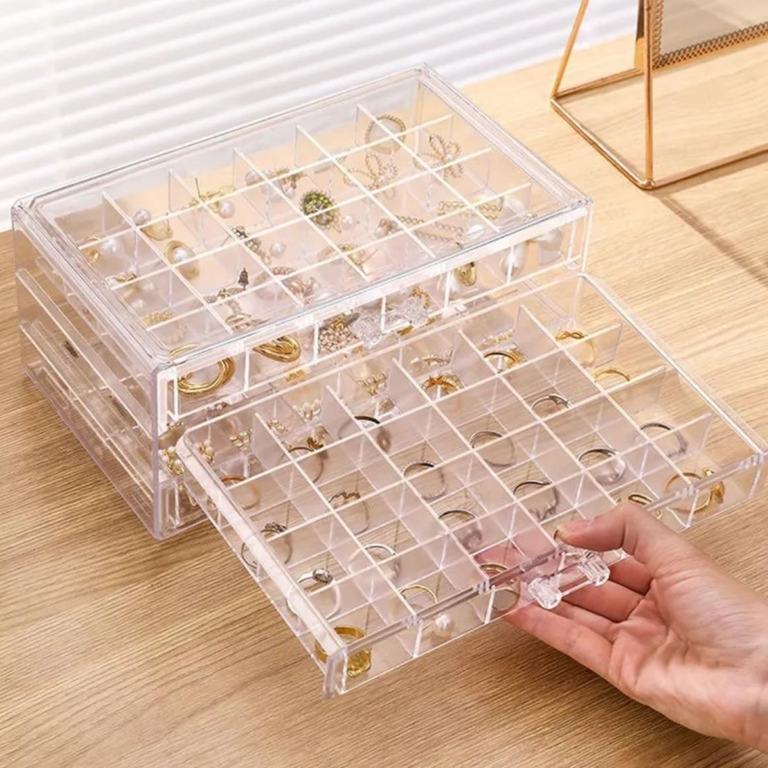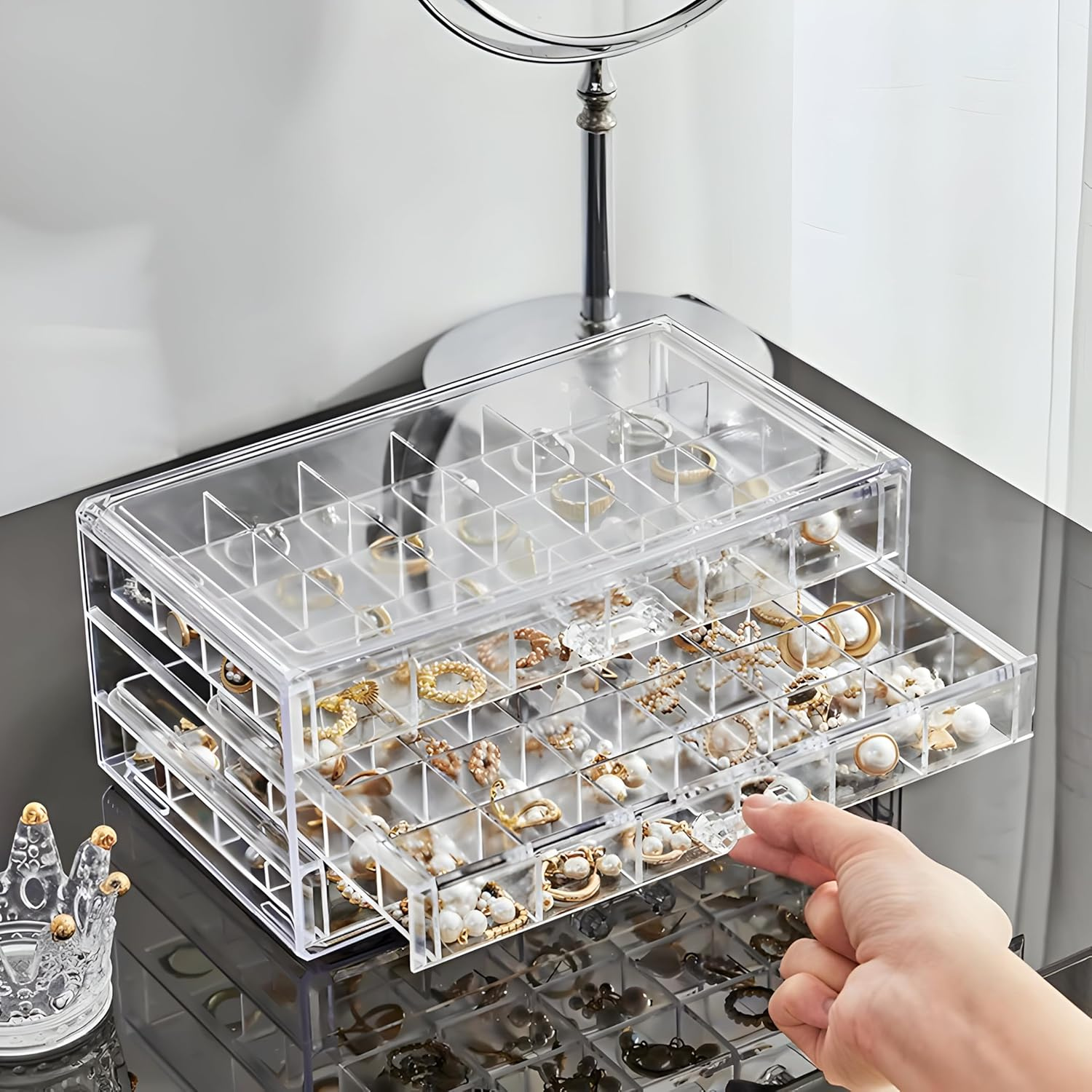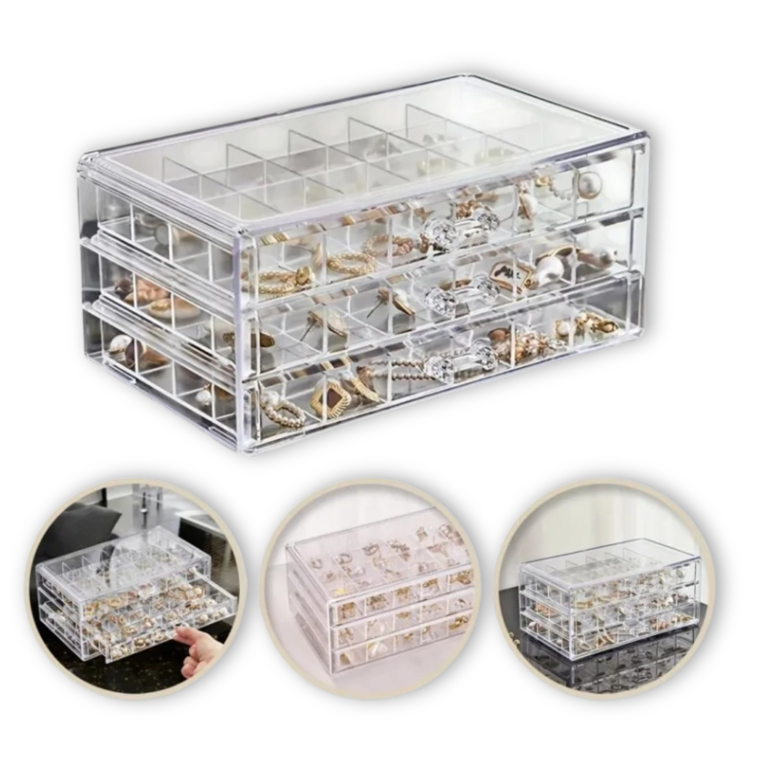 Fa-ti colectia de cercei sau inele vizibila si protejata! Suportul acrilic cu 72 de compartimente si 3 sertare ofera organizare perfecta, acces rapid si protectie impotriva prafului — tot intr-un design modern care se potriveste oricarui dressing.