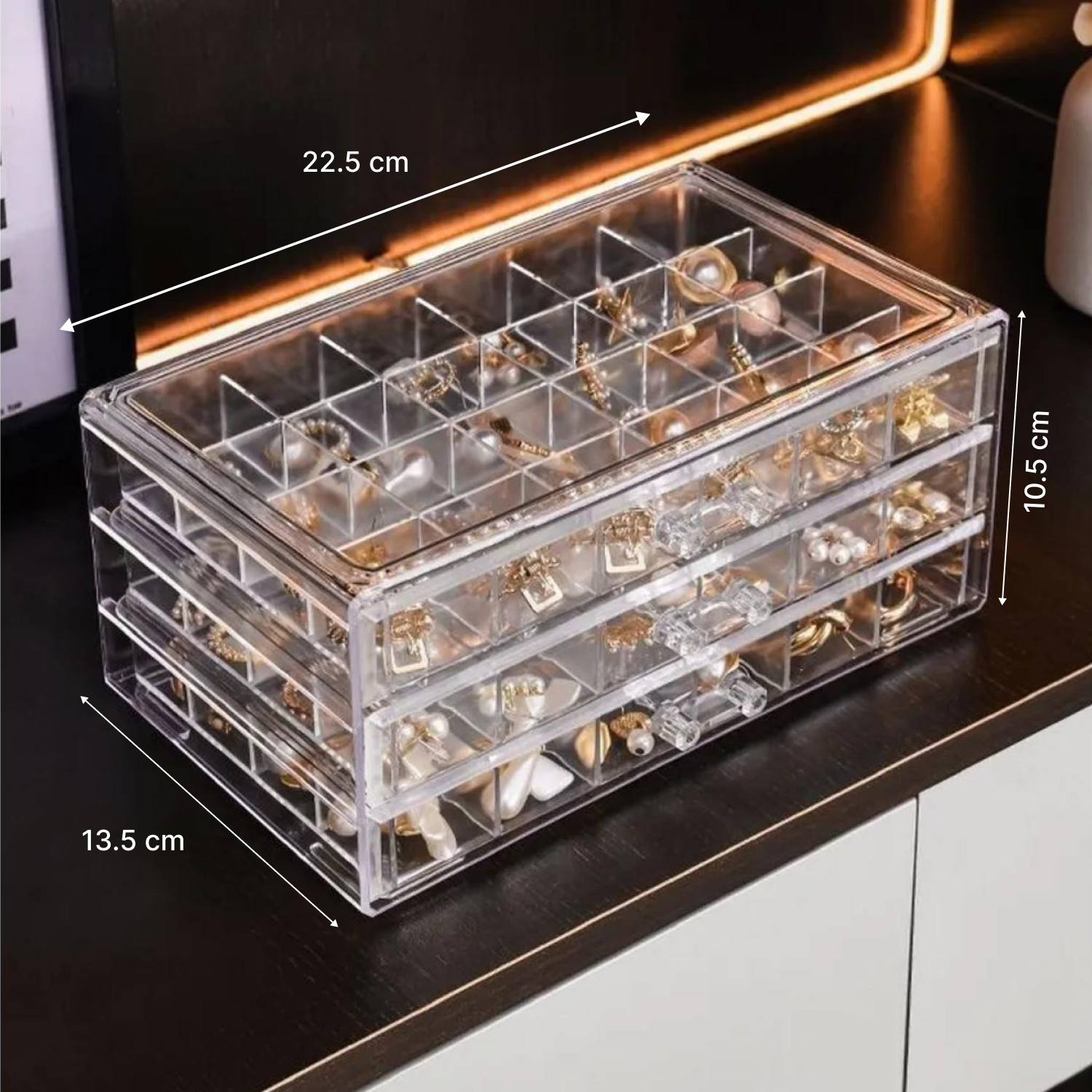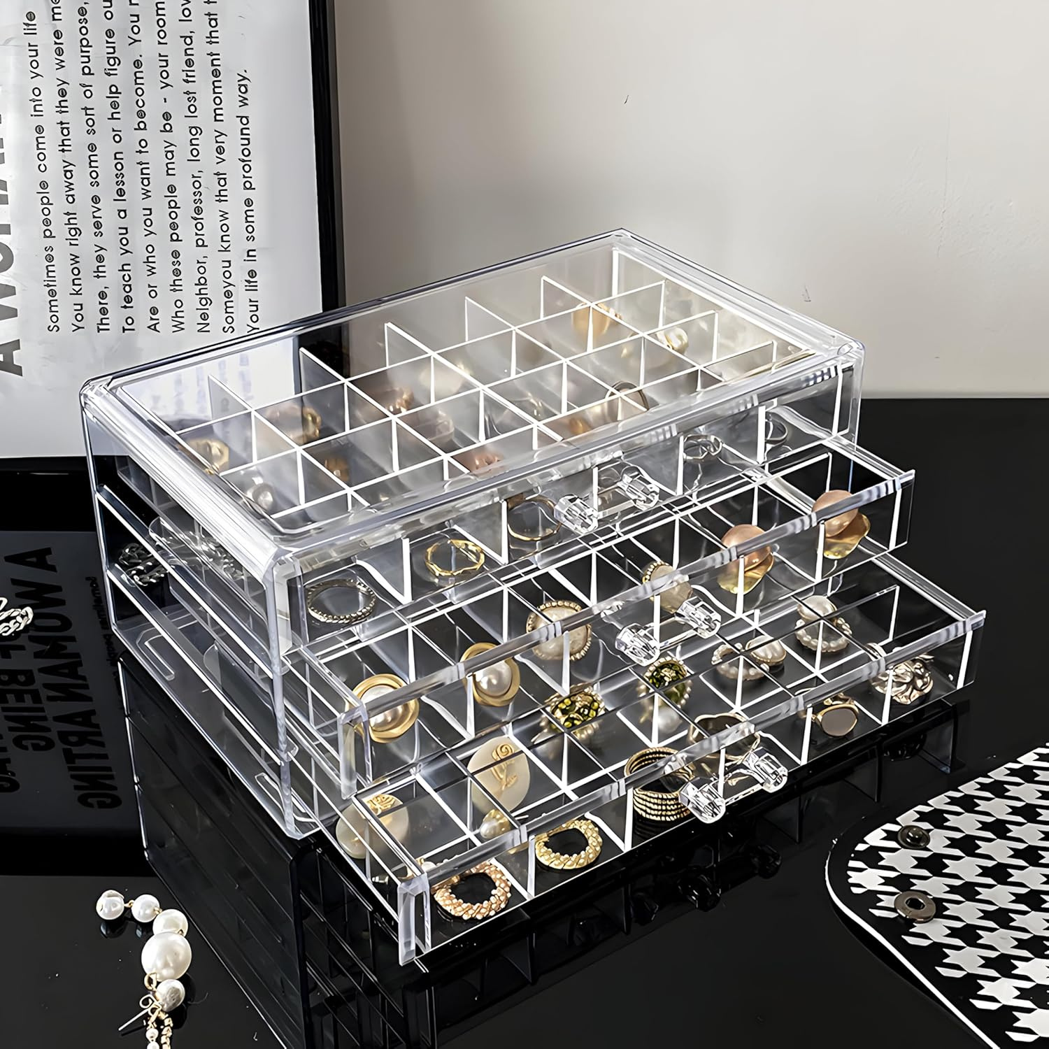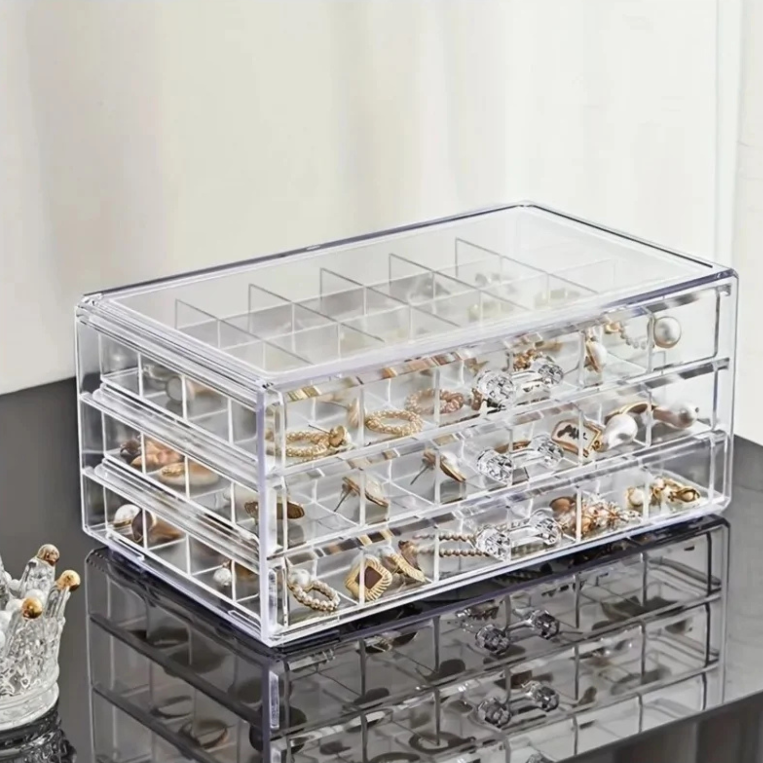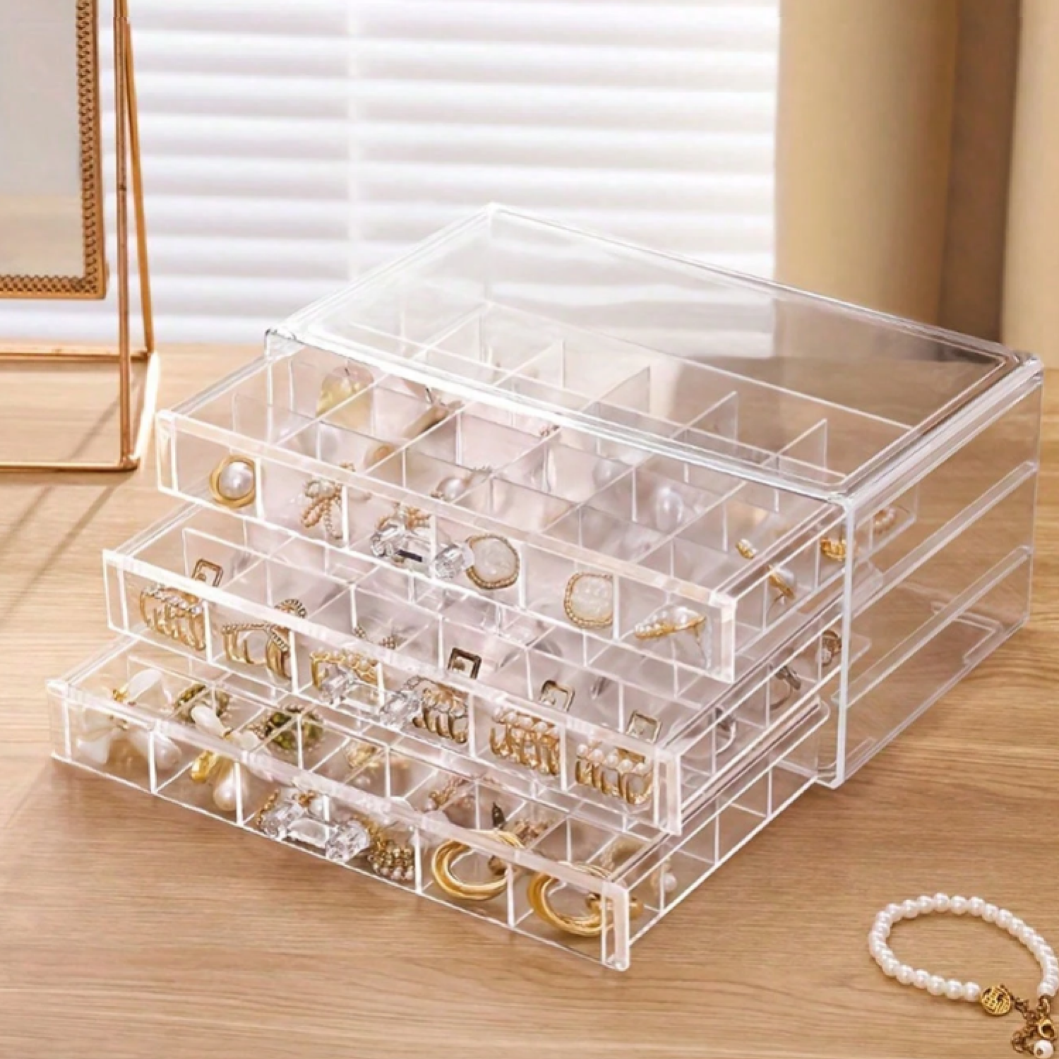 Fa-ti colectia de cercei sau inele vizibila si protejata! Suportul acrilic cu 72 de compartimente si 3 sertare ofera organizare perfecta, acces rapid si protectie impotriva prafului — tot intr-un design modern care se potriveste oricarui dressing.