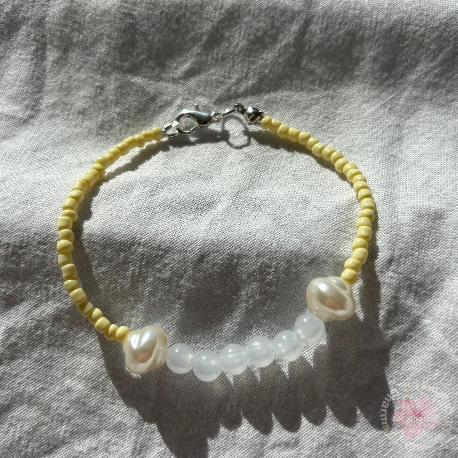This is a handmade bracelet with a classic preppy aesthetic, perfect for a summer look ☀️. It is crafted with soft pastel yellow seed beads, complemented by irregular freshwater pearls and translucent white quartz beads. It features a silver lobster clasp for a clean and elegant finish. 🍋✨🐚 and is glow in the dark