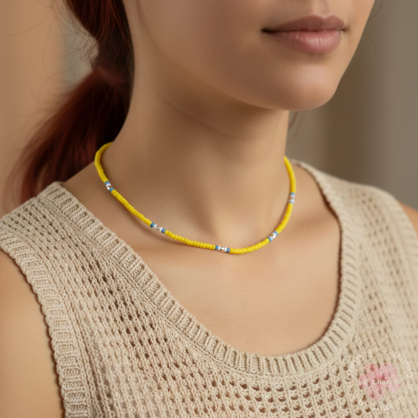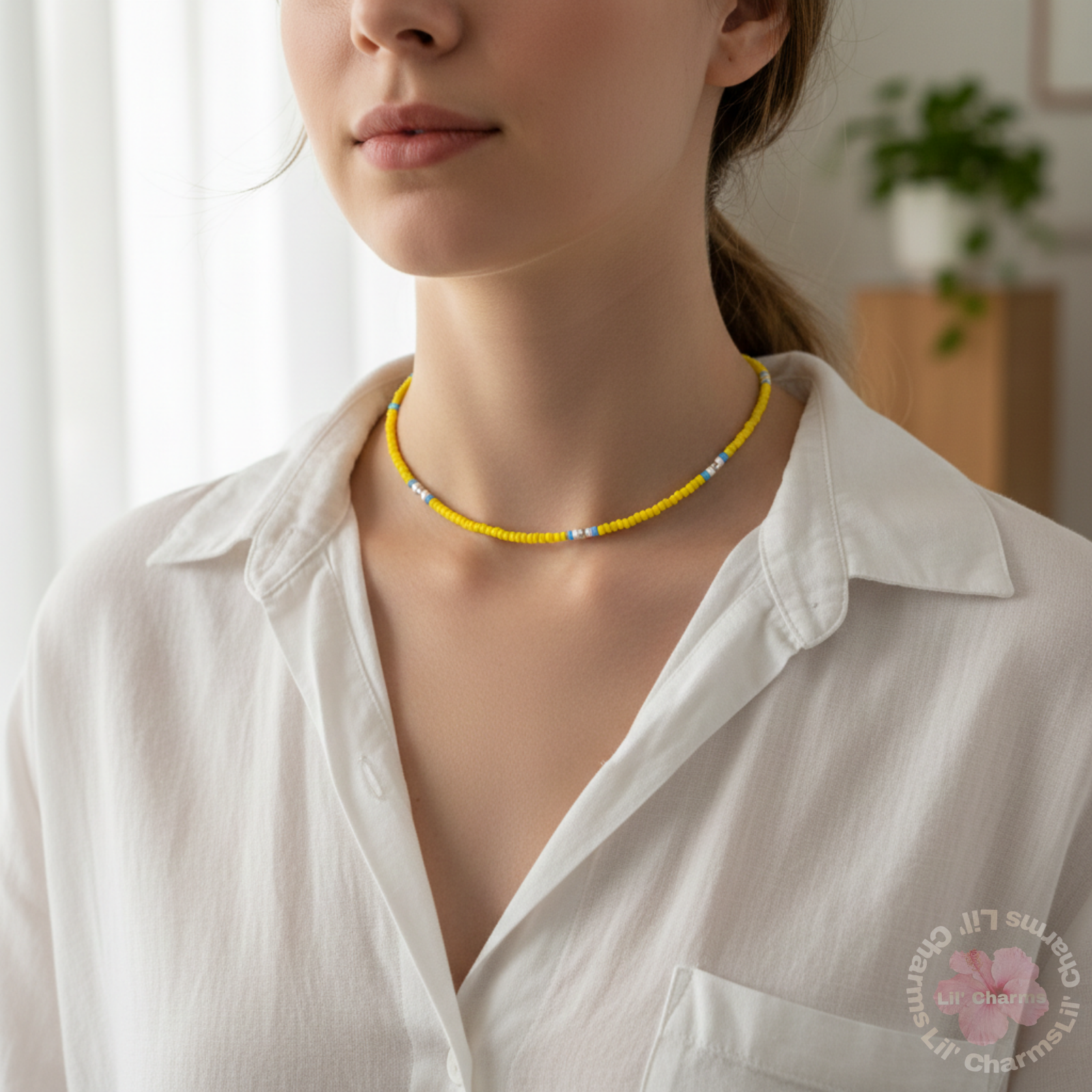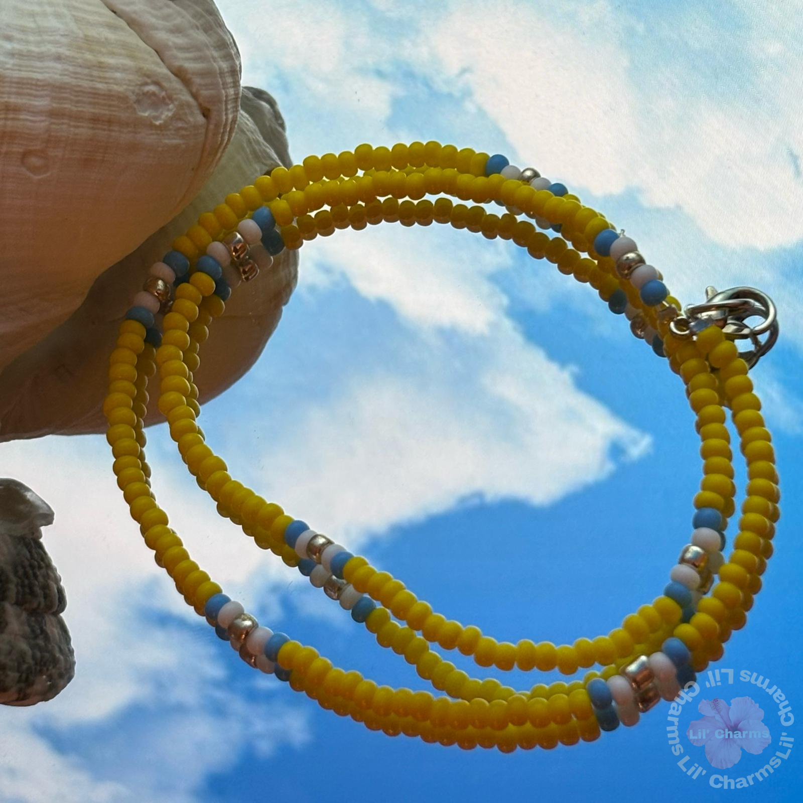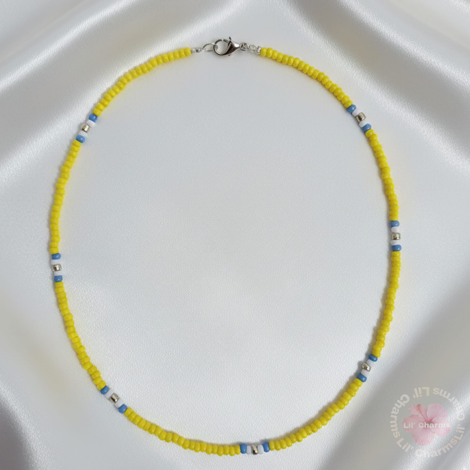 🤍 This is a vibrant handmade accessory ✨that can be worn as a necklace or a multi-strand bracelet. It is made with bright yellow seed beads ☁️, featuring intermittent accents in white, light blue, and small silver beads. It includes a practical metallic lobster clasp. ☀️🌊💛