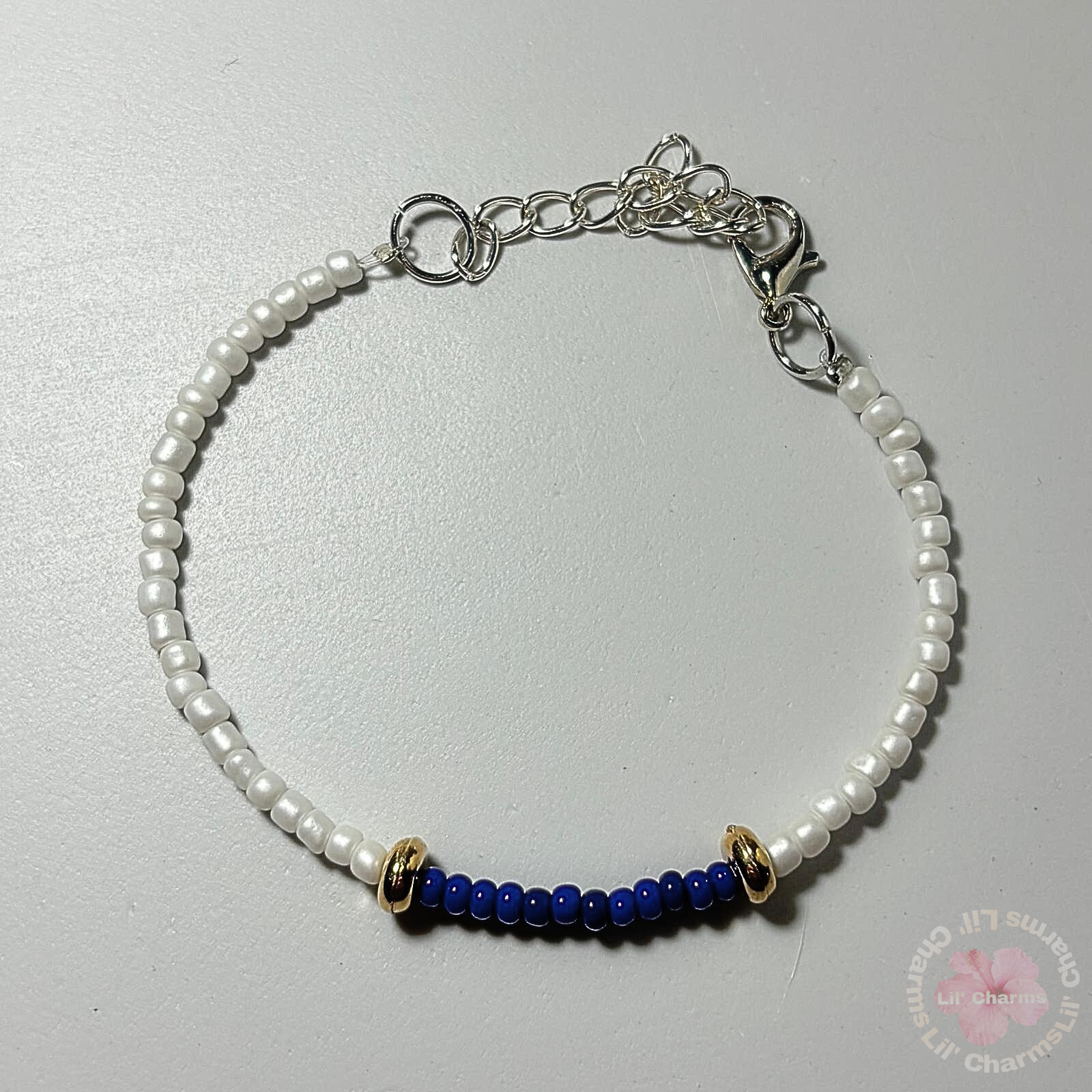 - Pearlescent white and royal blue glass seed beads 💎.