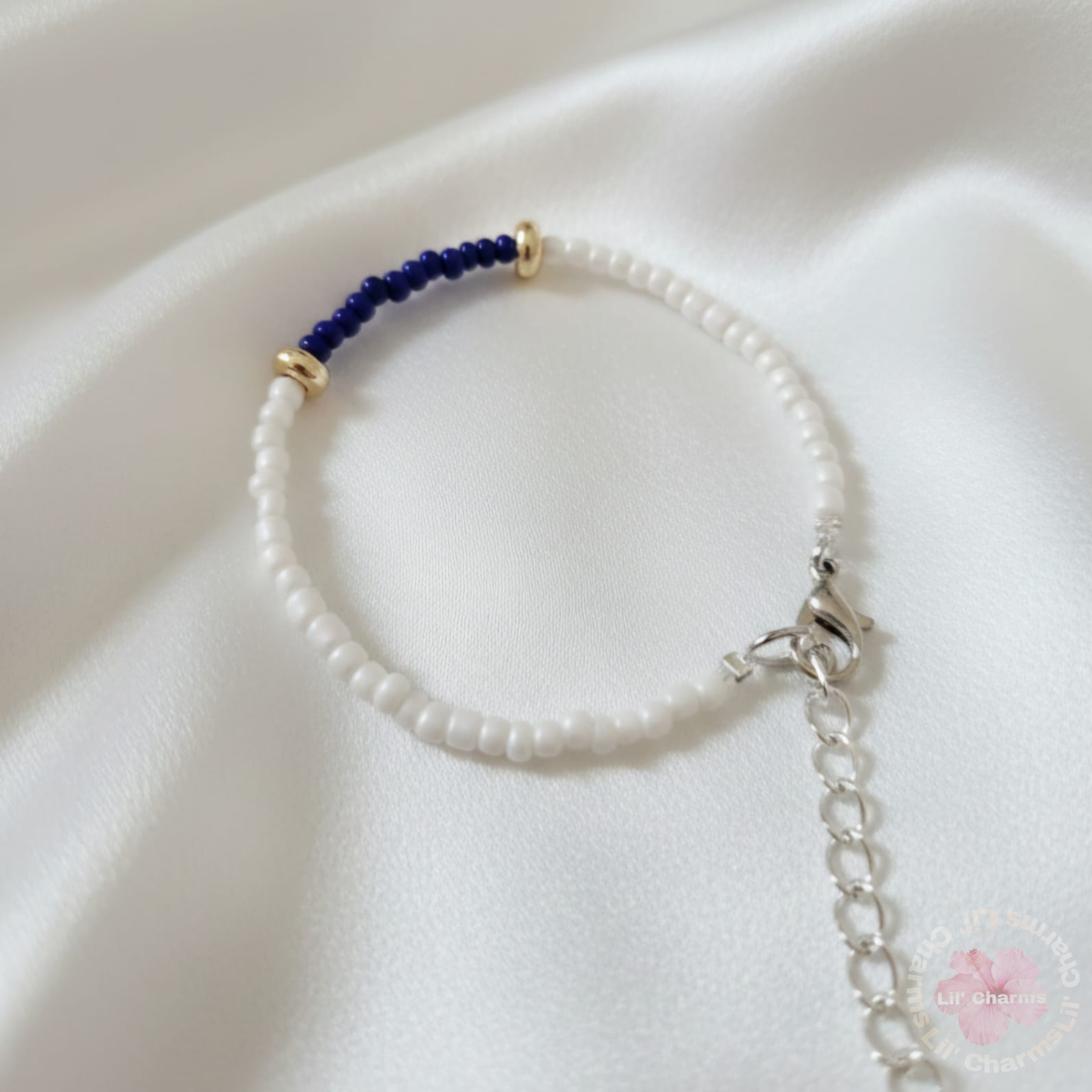 🤍 A sophisticated style bracelet featuring a pearlescent white bead base with an elegant navy blue center contrast 💙🤍.