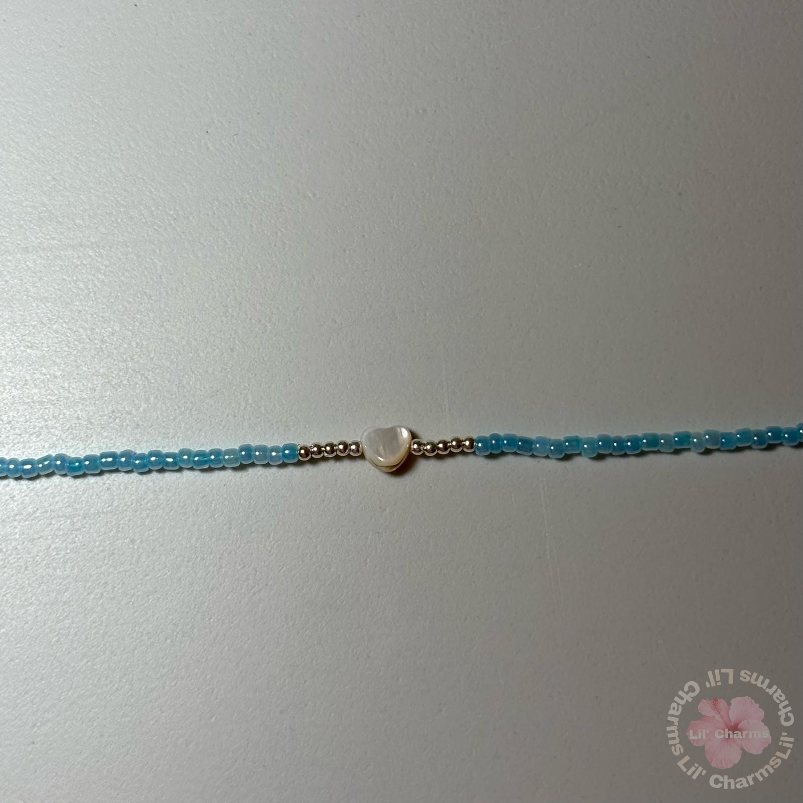 🤍 This is a delicate handmade necklace featuring light blue seed beads. It highlights a central mother-of-pearl heart charm flanked by small silver-toned accents. 🌊🤍💎