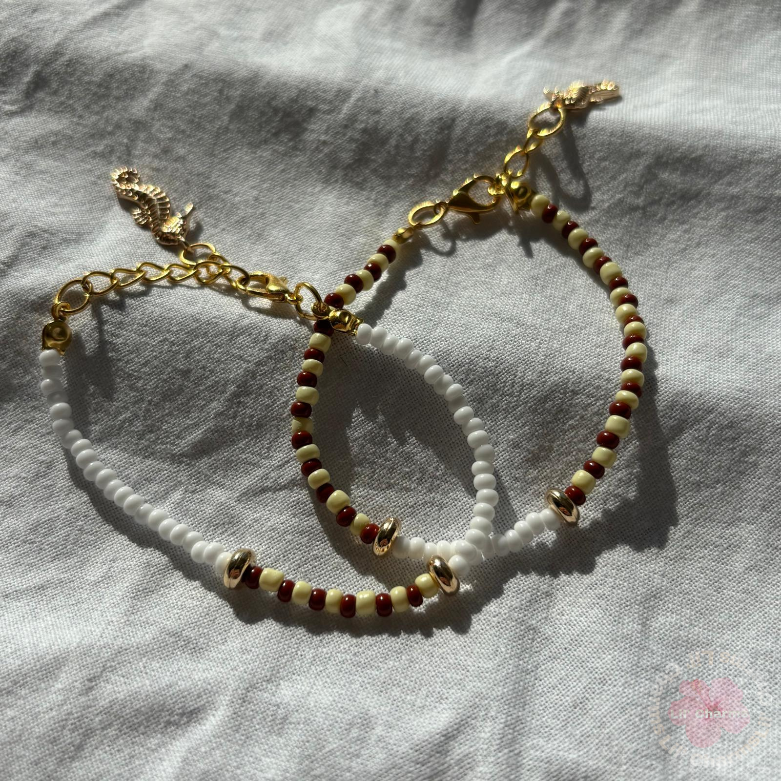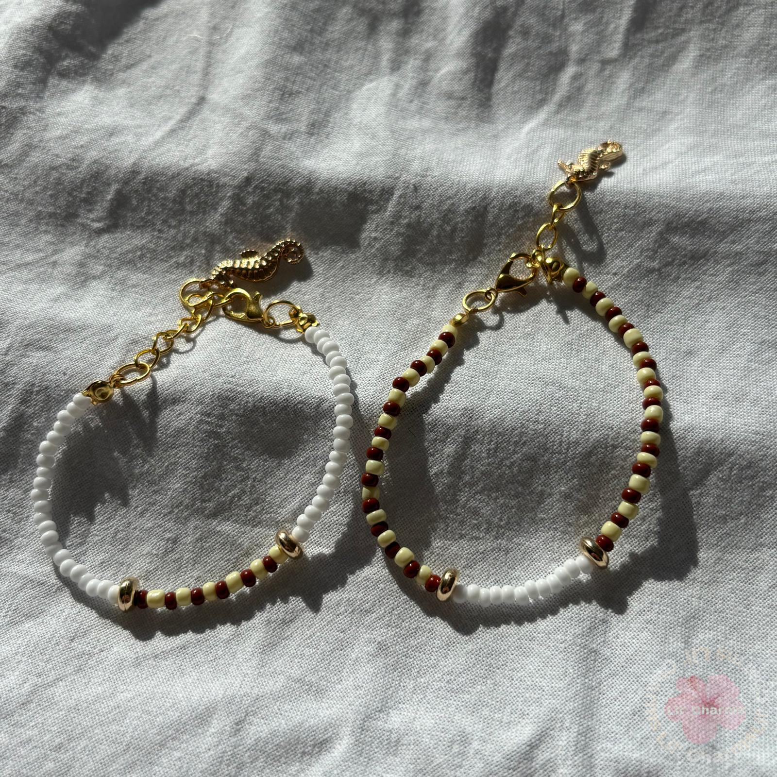 This is a handmade bracelet set with a classic preppy and nautical vibe, perfect for a coastal look ⚓. They are crafted with glass seed beads in white, cream, and maroon tones, highlighted by shiny gold beads. Each features an adjustable lobster clasp and a charming gold-plated seahorse charm. 🐎🌊✨