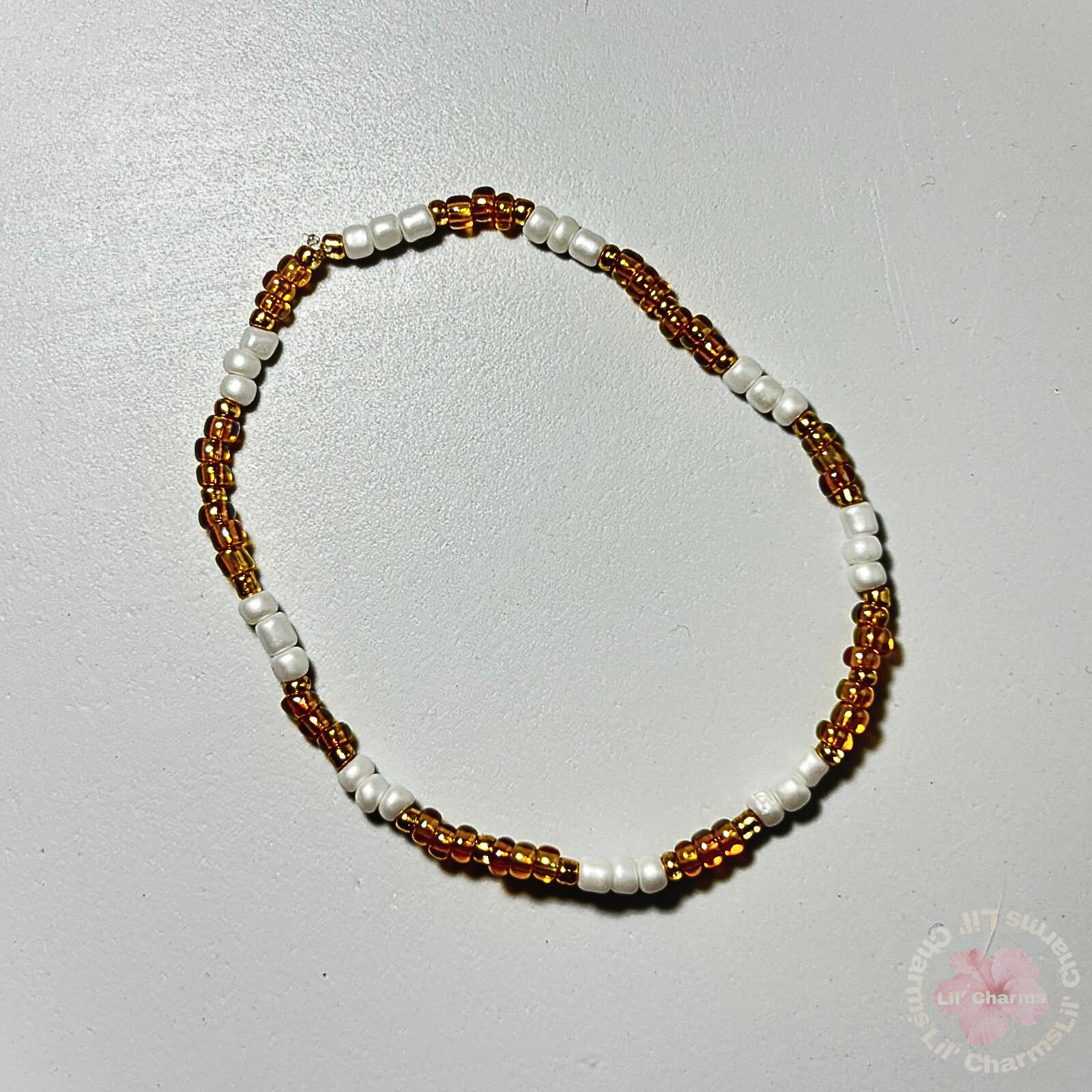 This is a handmade stretch bracelet with a simple and elegant design. It is crafted with glass seed beads in an alternating pattern of solid white and a warm, translucent amber tone. It is a versatile accessory, perfect for layering with other styles. 🍯⚪✨