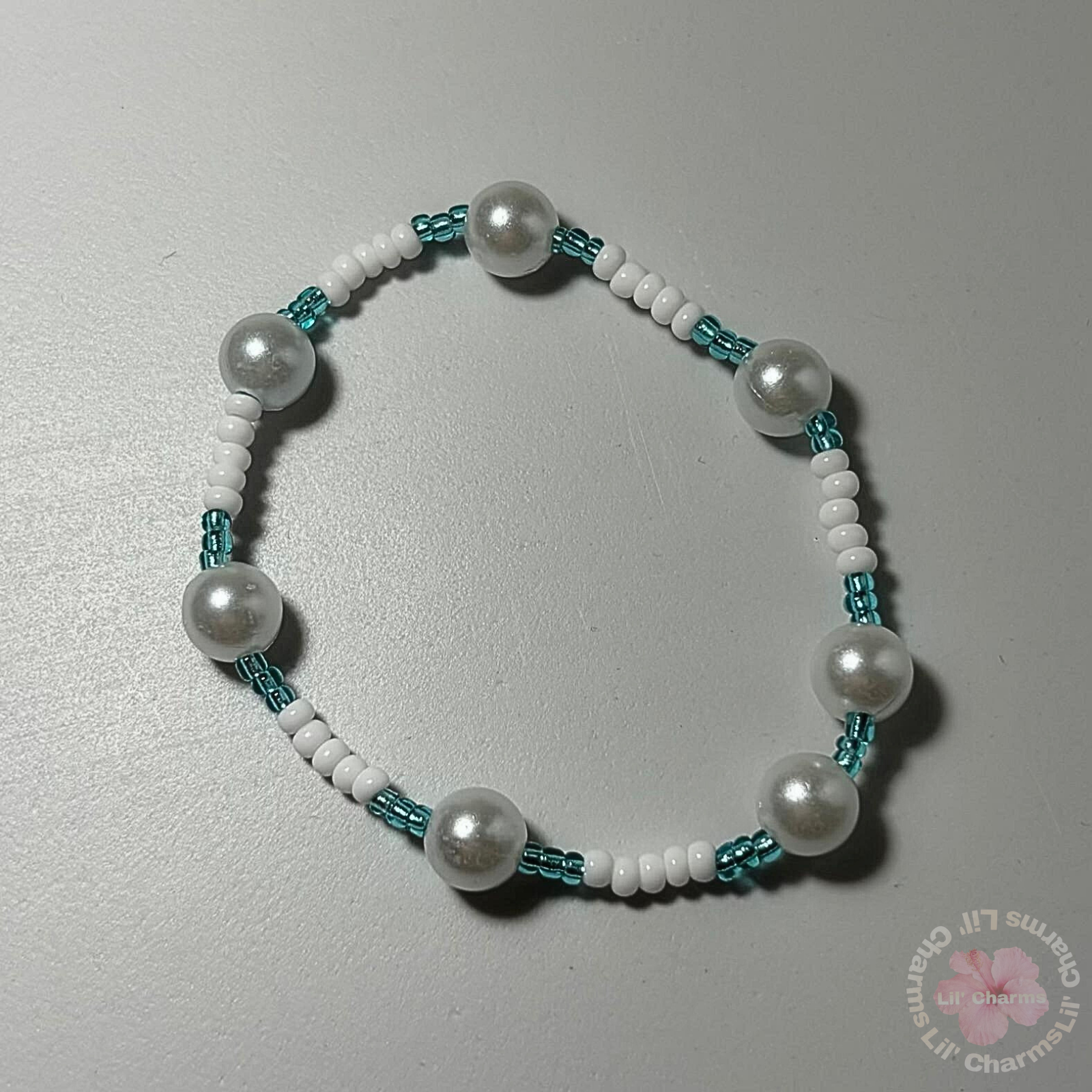 🤍 A preppy, coastal-style bracelet featuring alternating lustrous white pearls with delicate teal and white seed beads 🌊🤍.