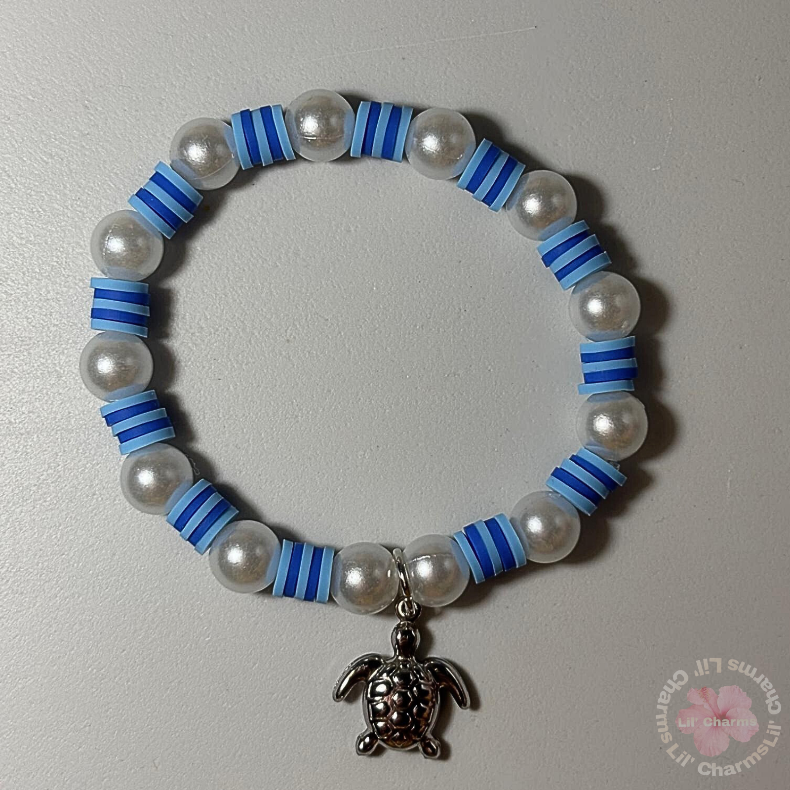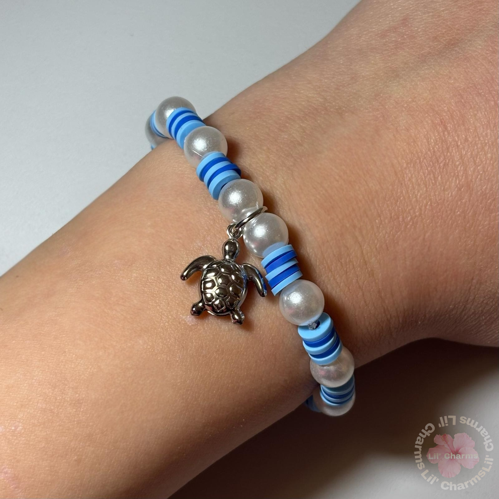 🤍✨ This bracelet features clay beads in ocean blue tones mixed with shiny pearls and a cute silver turtle charm. 🐚💙 The ultimate aesthetic accessory for your beachy look! 🥥☀️
