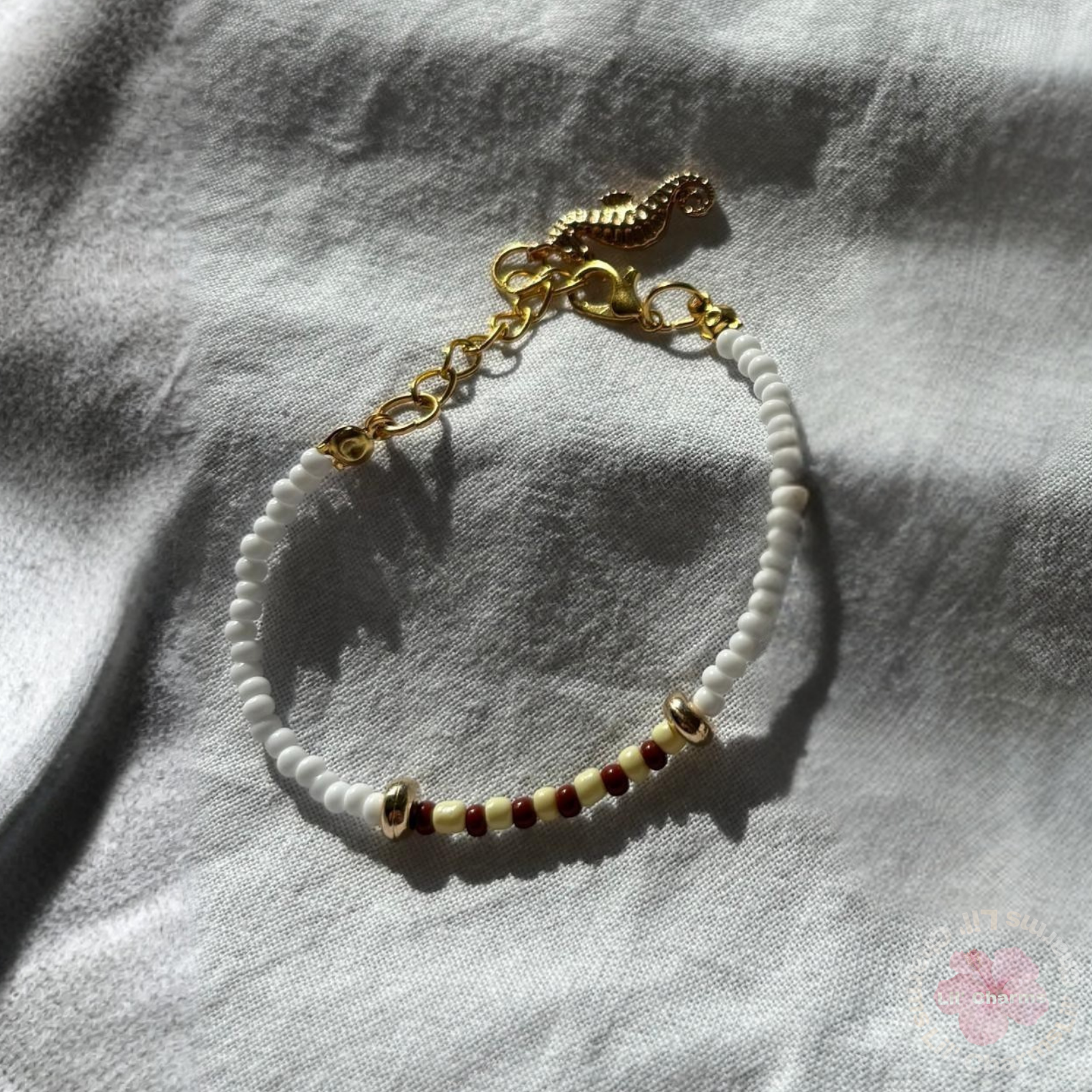 his is a handmade bracelet with a preppy and nautical aesthetic ⚓. It is crafted with seed beads in cream and maroon tones, highlighted by a pure white center section and shiny gold beads. It features an adjustable lobster clasp with a charming golden seahorse charm. 🐎🌊✨